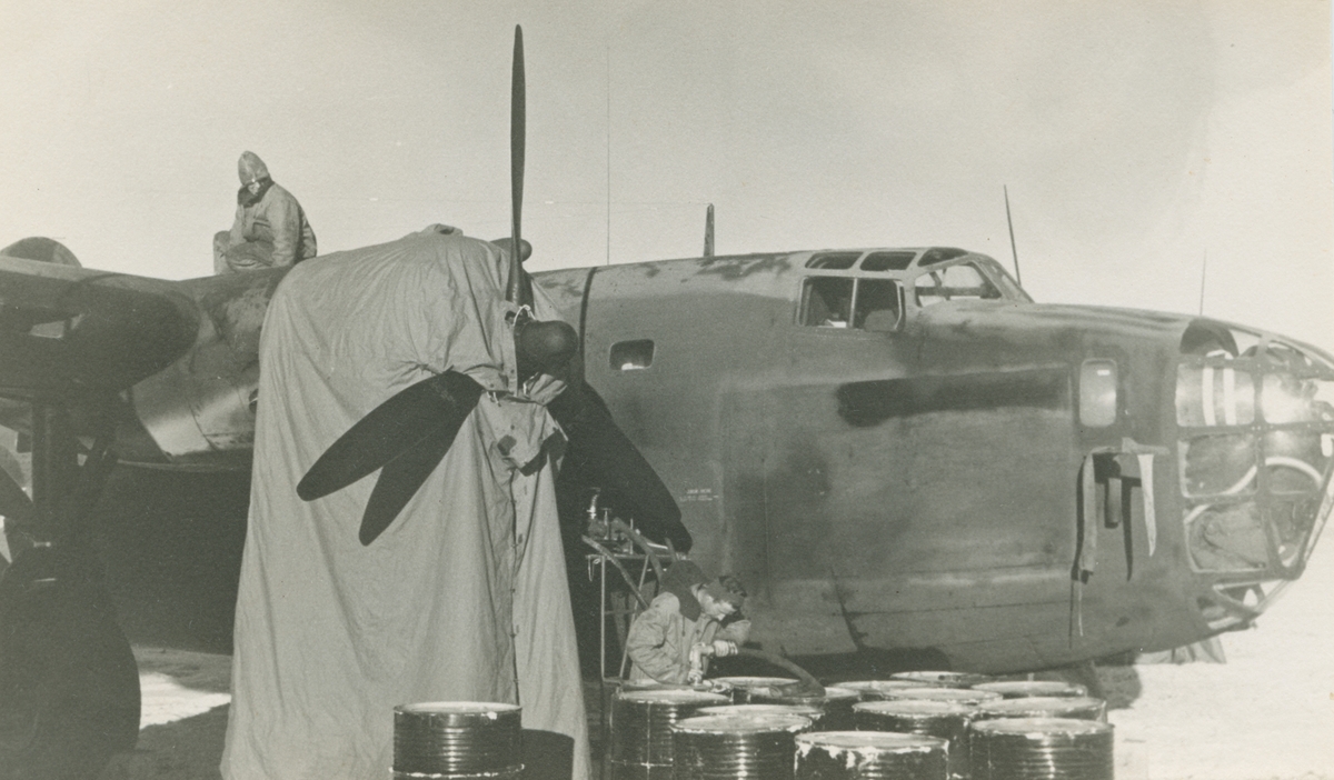 Fotografi från låda märkt Bernt Balchen. Balchen var norsk-amerikansk flygare, polarforskare och militär. Motiv av två män vid flygplan och bränsletunnor. Flygplanet är eventuellt en Consolidated B-24 Liberator.