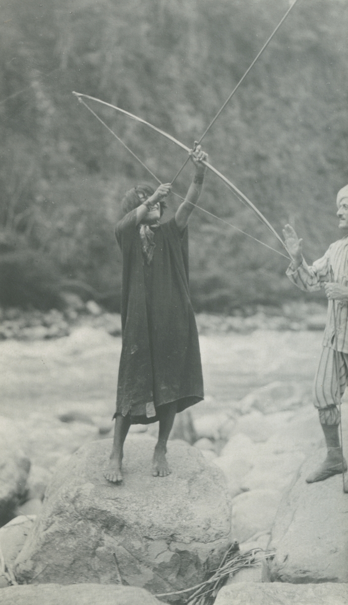 Fotografi från Peruexpedition 1920. Motiv av pojke som står på en klippa och siktar med en pilbåge.