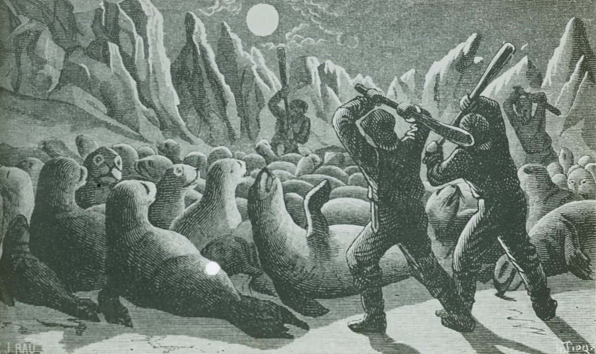 Fotografi från Grönland. Teckning med motiv av sälklubbning.