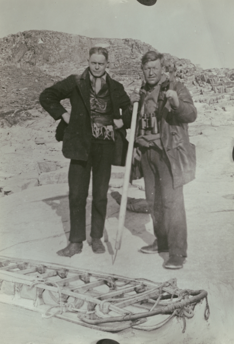 Fotografi från Ahlmannexpeditionen 1931. Motiv av Kapten Schjelderup och Håkon Mosby på Foynön.
