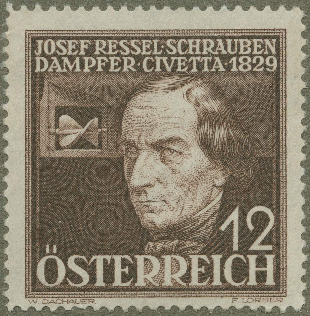 Frimärke från Österrike, 1936. Motiv av Joseph Ressel 1793-1857. Österrikisk tekniker. Skruvpropeller 1827. Propellerångaren "Chivetta" 1829. "Serie: Teknikare och Uppfinnare:"
