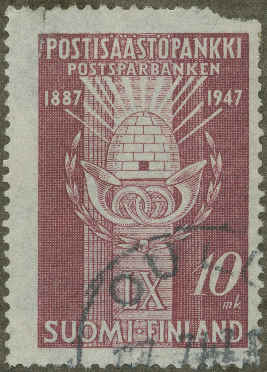 Frimärke från Finland, 1947. Motiv av Posthorn Bikupa Symbol för postsparbanken -Finlands postsparbank 60 år: 1887-1947.-