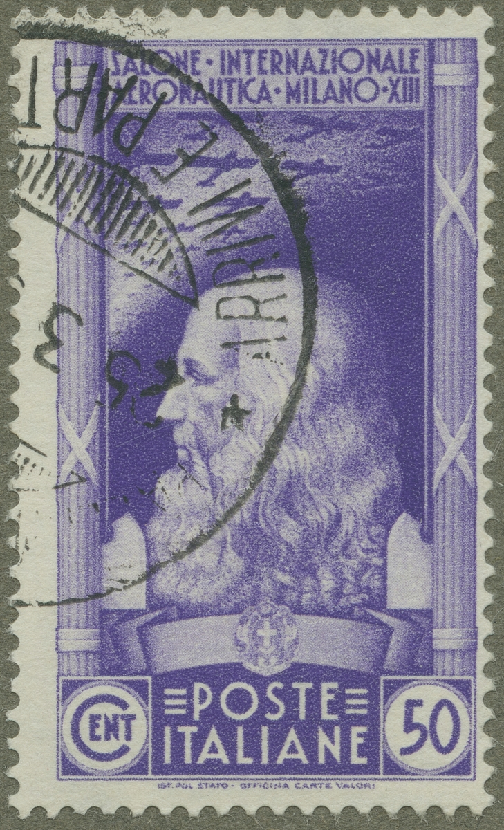 Frimärke från Italien, 1935. Motiv av Leonardo da Vinci 1452-1519. Italiensk konstnär och tekniker. Utkast till flygapparat med muskelenergi som drivkraft. Första internationella flygutställningen i Milano.