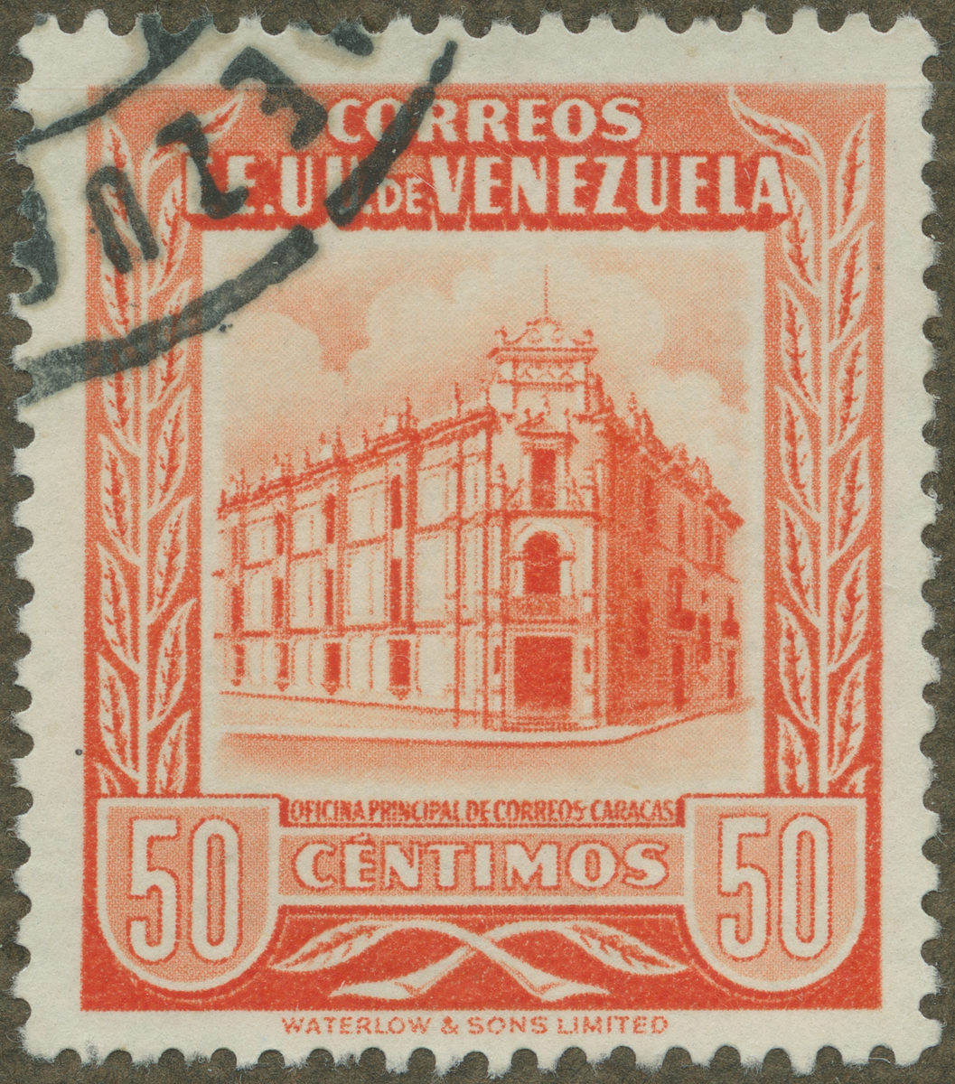 Frimärke från Venezuela, 1953. Motiv av Huvudpostkontoret i Caracas