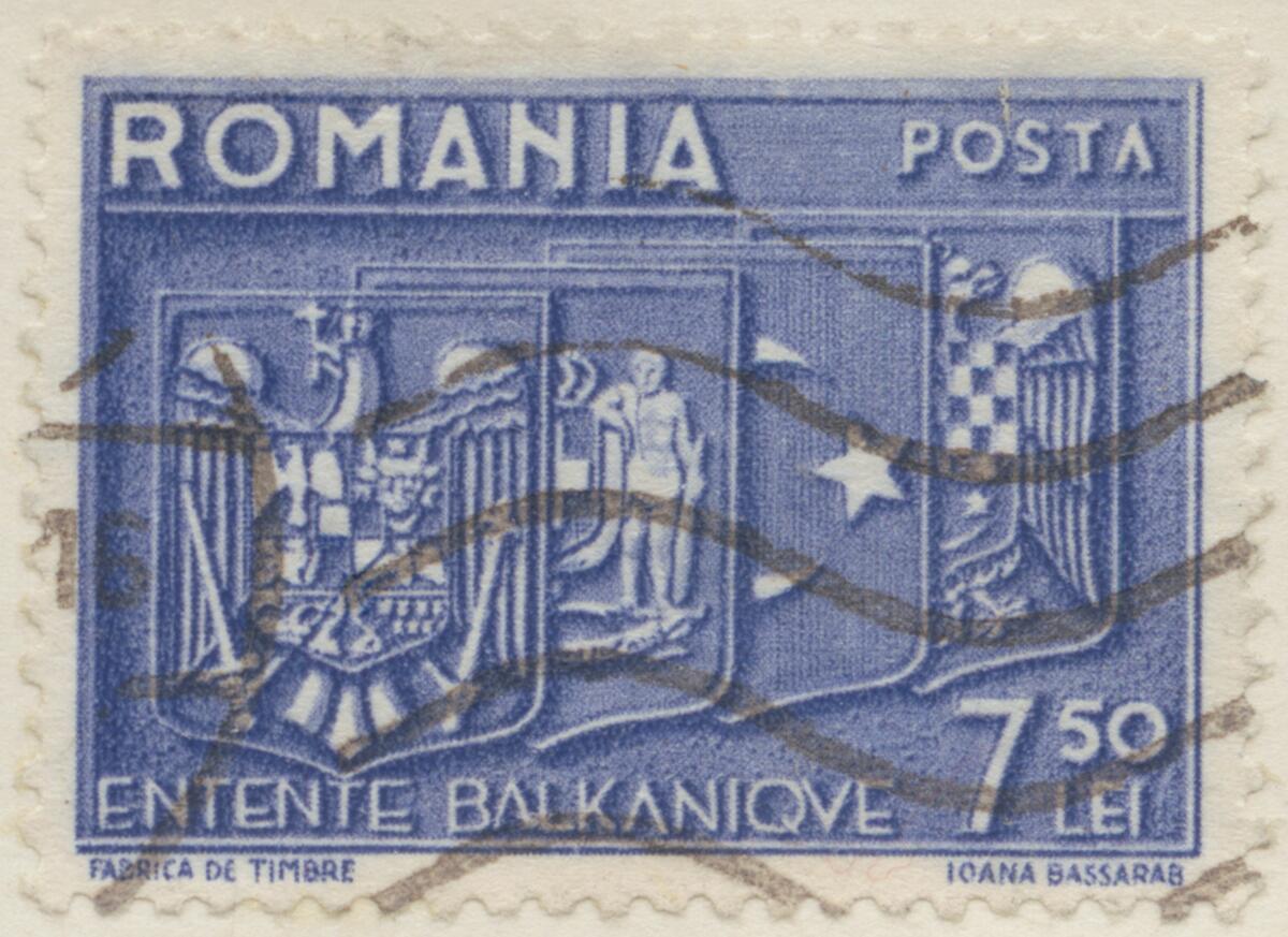 Frimärke från Rumänien, 1938. Motiv av Balkan Ententens Vapen Grekland Rumänien Jugoslavien Turkiet