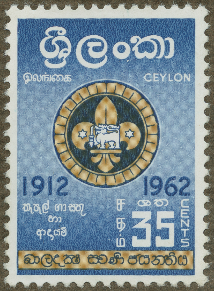 Frimärke från Ceylon, 1962. Motiv av Heraldiskt lejon. och "Boy Scout" emblem- -50-års jubileum av "Boy Scout" rörelsen i Ceylon-