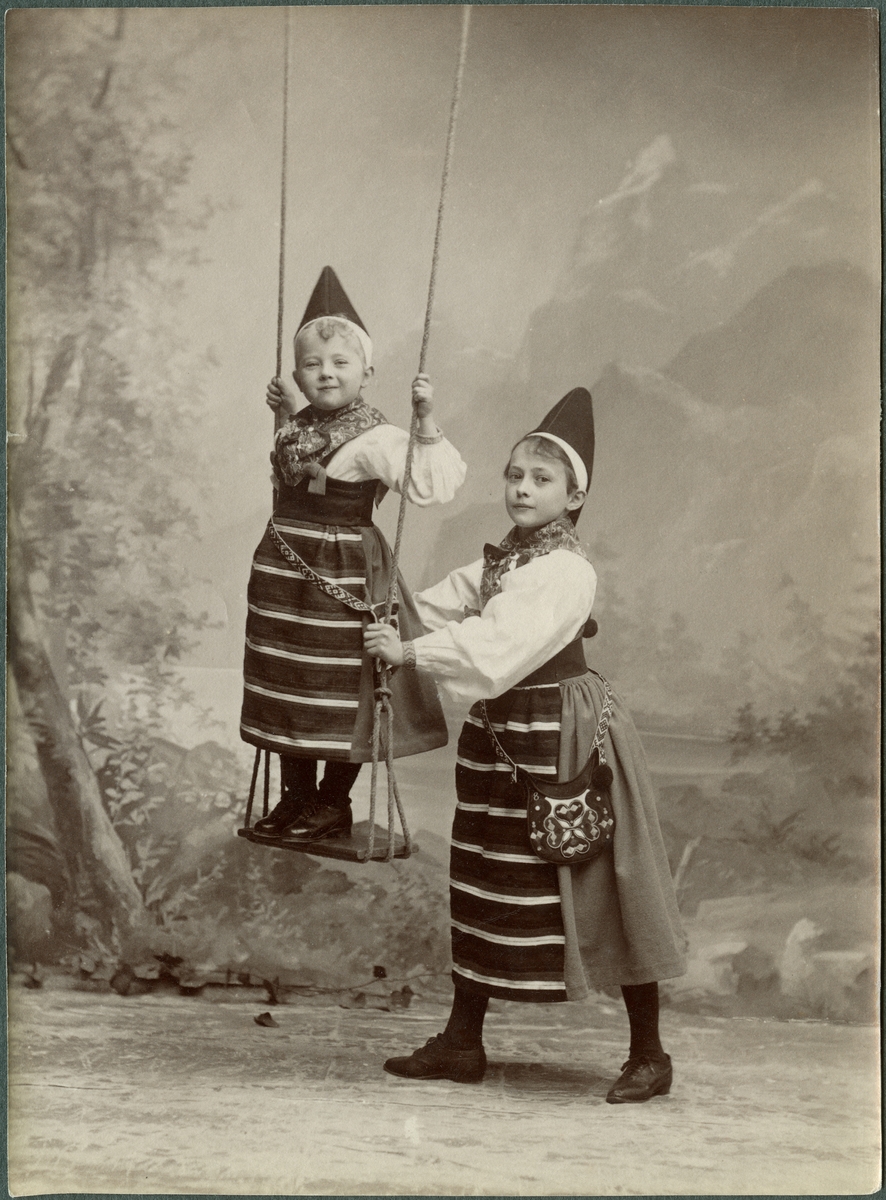 Ateljéporträtt av flickebarn iklädda Rättviksdräkt.