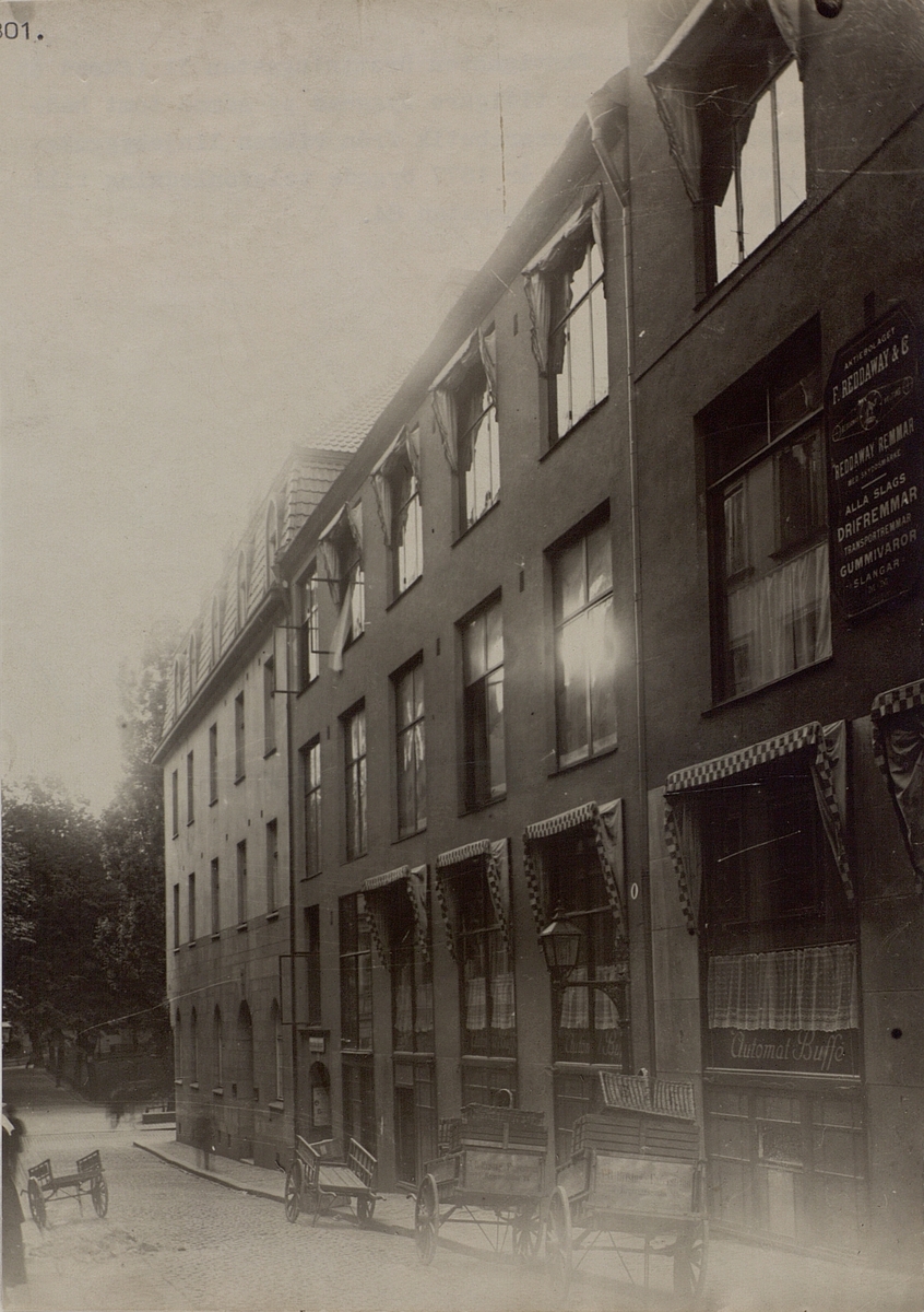 Fastigheten Drottninggatan 31. I en tidigare byggnad på samma tomt hade H.T. Cedergren en juvelerarbutik från vilken linjebyggmästare Nilsson år 1877 byggde telefonledning till Cedergrens bostad, Drottninggatan 84. Huset byggdes omkring år 1905. Fotot taget mellan åren 1910-1938.