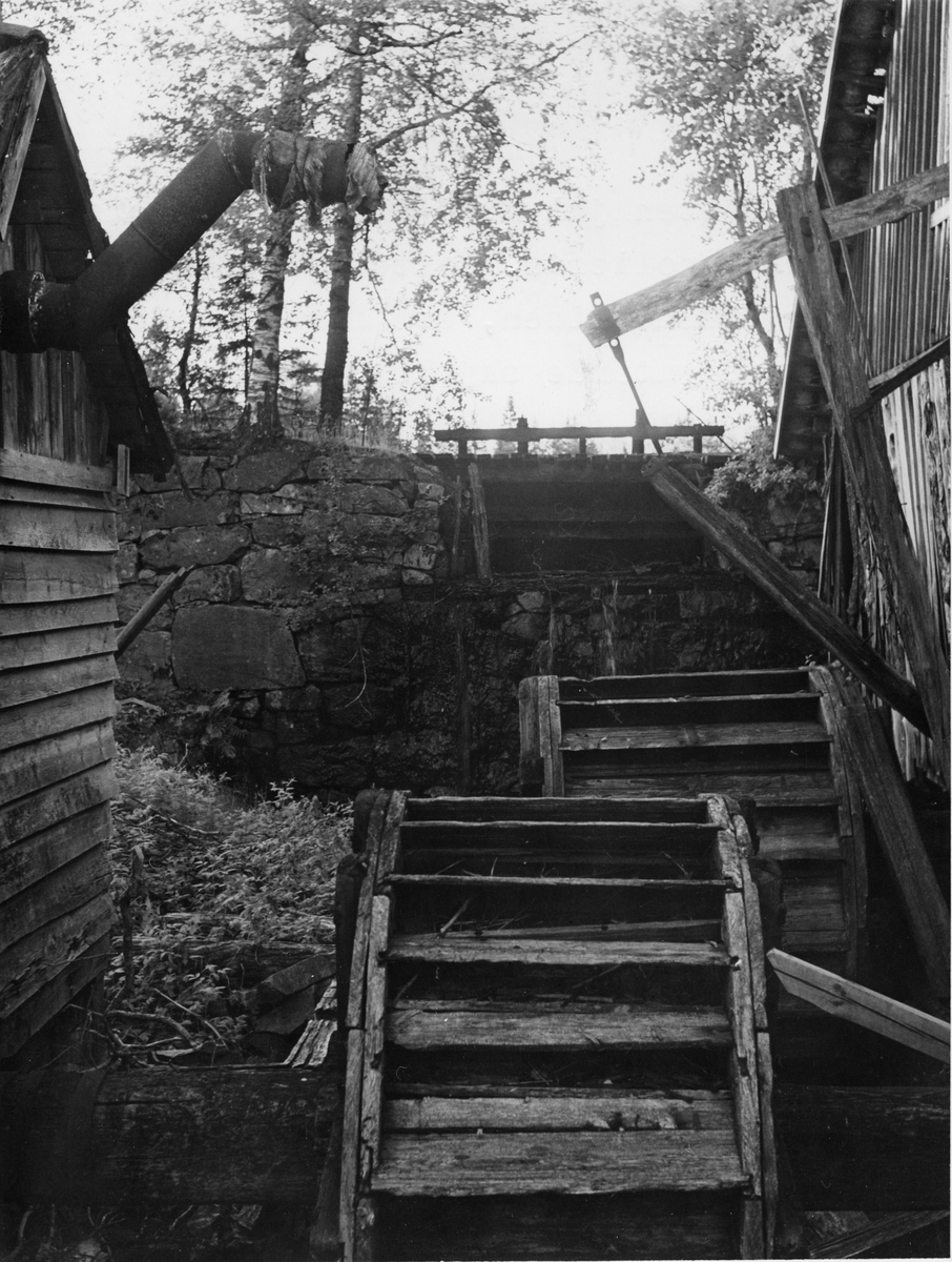 Skogafors bruk. Exteriör av hammarsmedjan vid Skogafors. Sumpen totalt spolierad. Vattenhjulet närmast drar blåsmaskinen, som finns i det till höger skymtande skjulet. Längst bort hjulet till hammaren