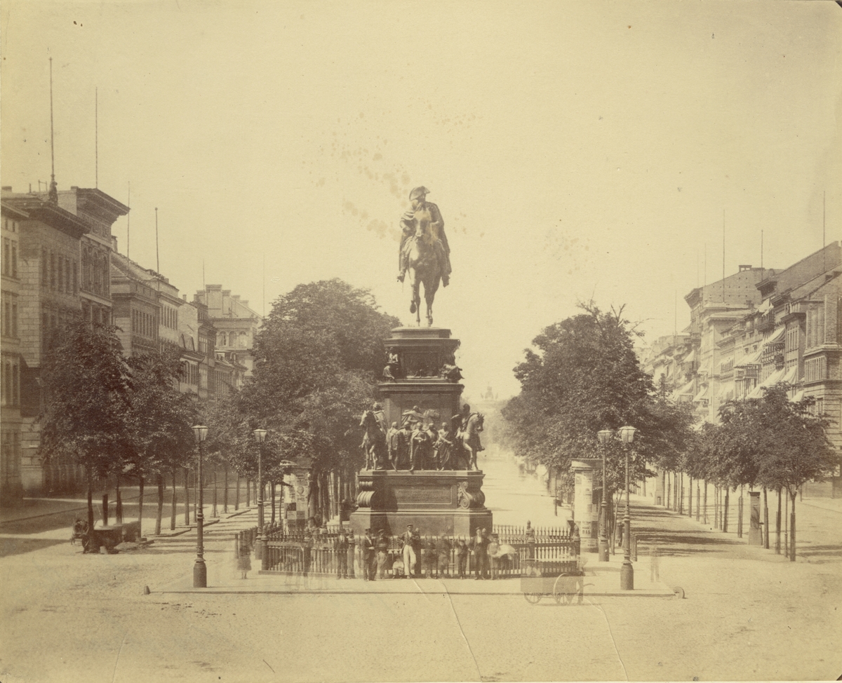 Unter den Linden, Berlin, 1886. Staty av Fredrik den Store.