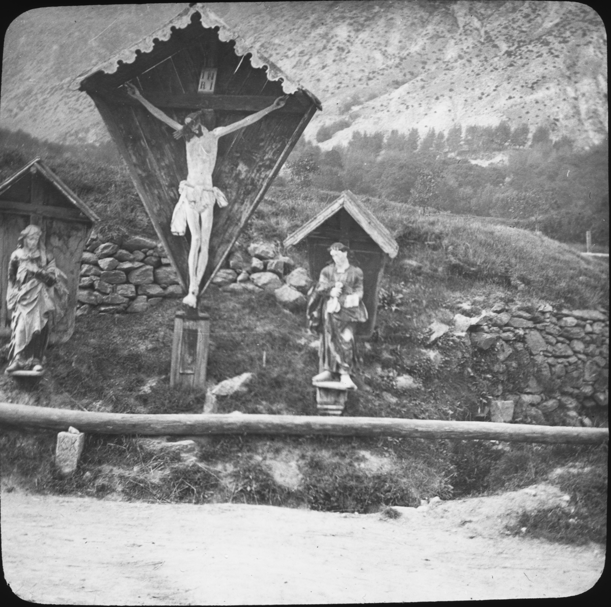Skioptikonbild med motiv av religiöst monument i närheten av Schloss Castelbell i Vinschgau, Sydtyrolen.