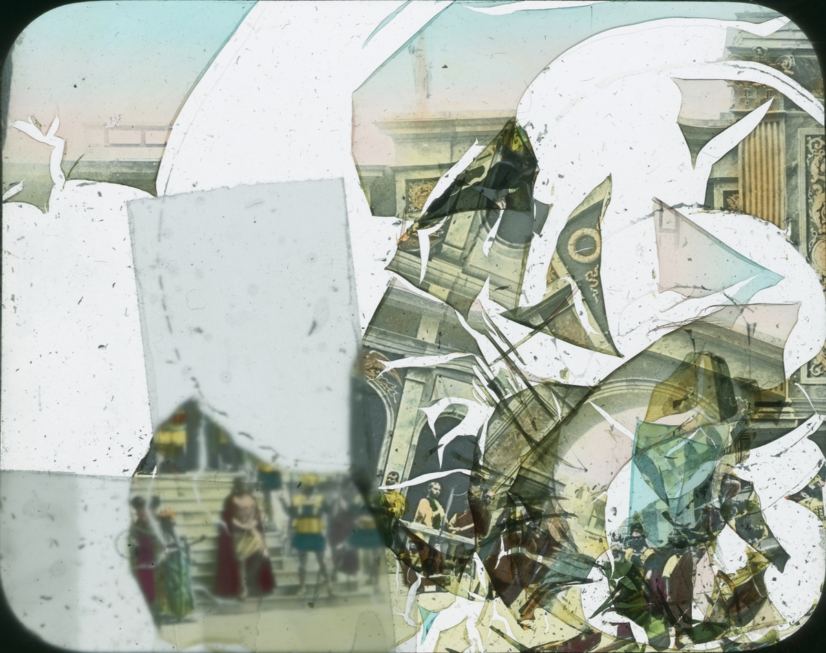 Kolorerad skioptikonbild med okänt motiv. Scannad pga dess nedbrytning.