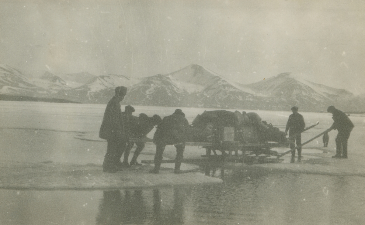 Spetsbergen övriga bilder. Motiv av män som bygger en bro över spricka i isen, 1918.
