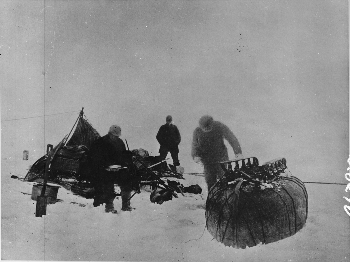 Lägret brytes. Till höger Andrée och Fraenkel vid den upp -och nedvända båten. Framtagning av bilderna gjordes av docen John Hertzberg år 1930 på Fotografi, Tekniska Högskolan.
