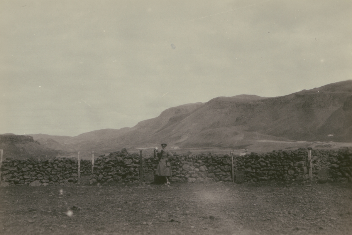 Fotografi från Albin Ahrenbergs resa till Grönland 1929. Motiv av man framför stenmur i bergslandskap.