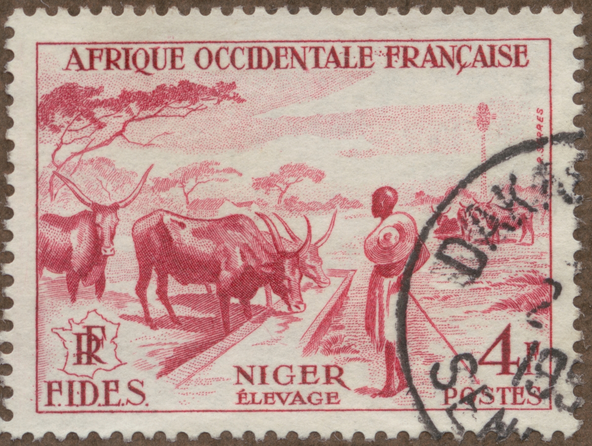 Frimärke från Franska Väst Afrika, 1956. Motiv av Vattning av hornboskap vid Niger