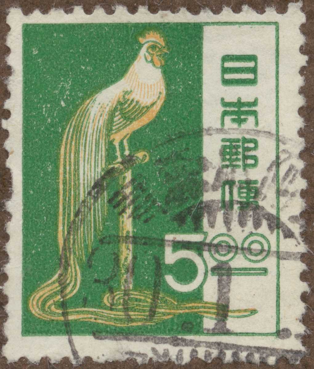 Frimärke från Japan, 1951. Motiv av Tuppen Tosa med lång-lång stjärt