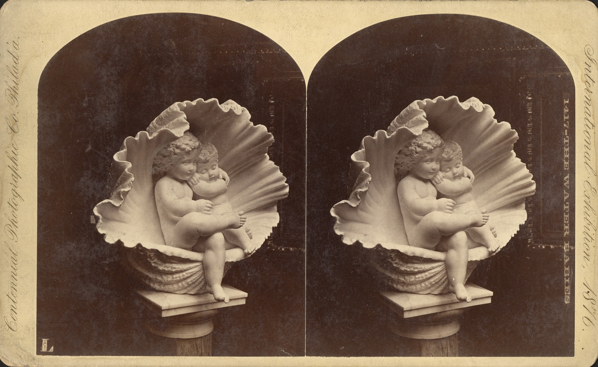 Stereobild av skulptur/ staty, "The Water Babies" (vatten bebisarna), två små barn i snäckskal.