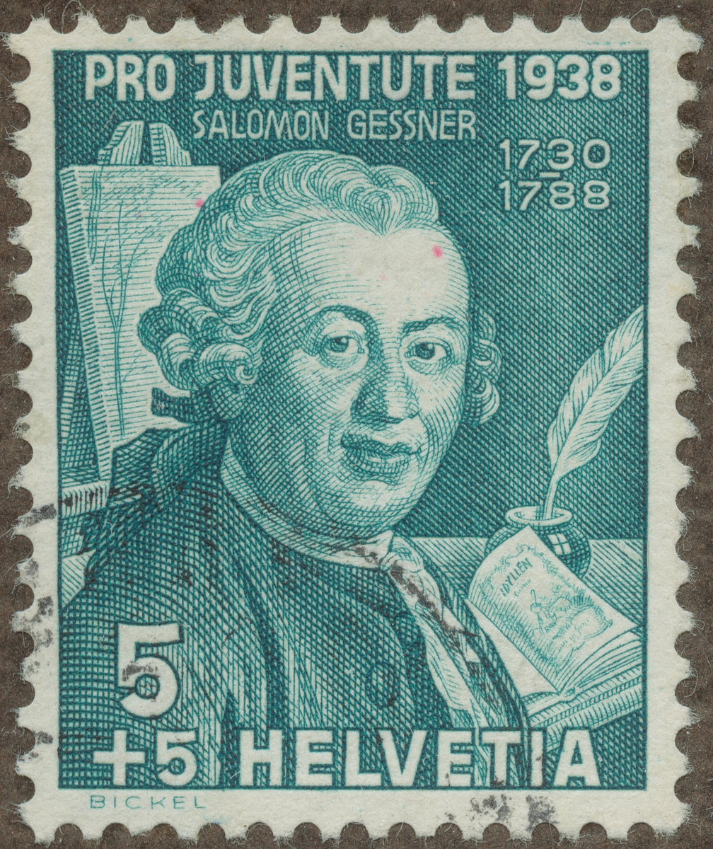 Frimärke från Schweiz, 1938. Motiv av Salomon Gessner 1730-1788 Skald och etsare