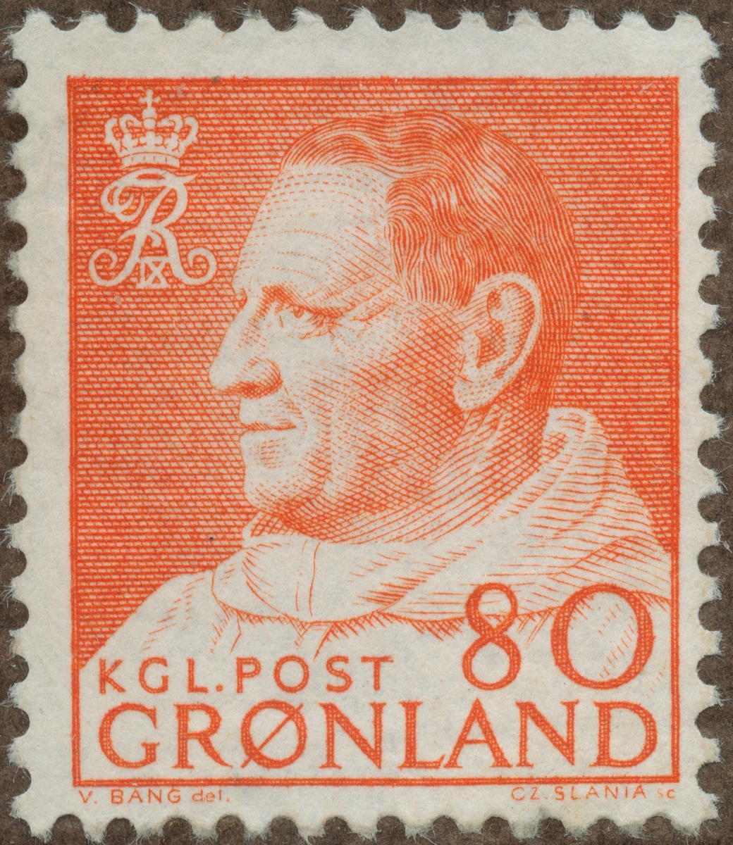 Frimärke från Danmark, 1963. Motiv av Konung Frederik IX av Danmark. F. 1899- i grönländsk dräkt.