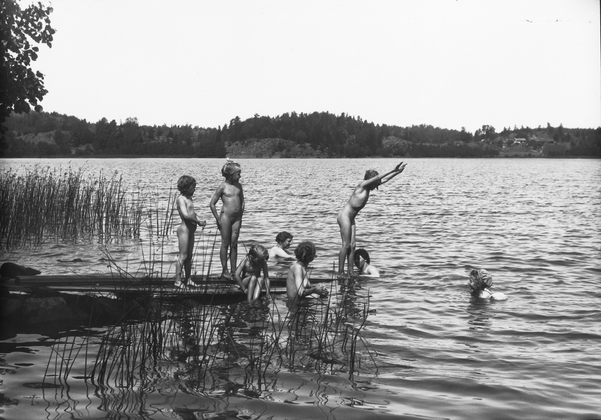 Diapostiv, fönsterbild med naturmotiv, sommarmotiv. Badande barn vid brygga.