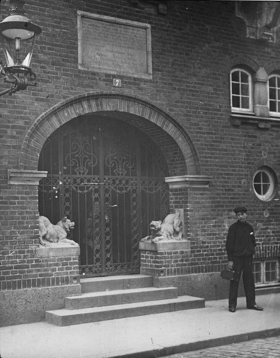 Skioptikonbild med motiv av valvport med grindar, okänd byggnad, okänd stad.