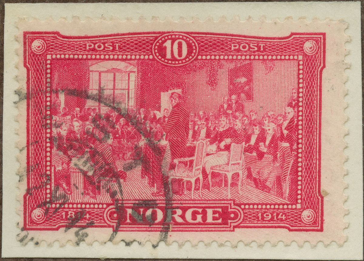Frimärke från Norge, 1914. Motiv av Det norska Eidsvollbeslutet 100-årsminne av konstitutionen
