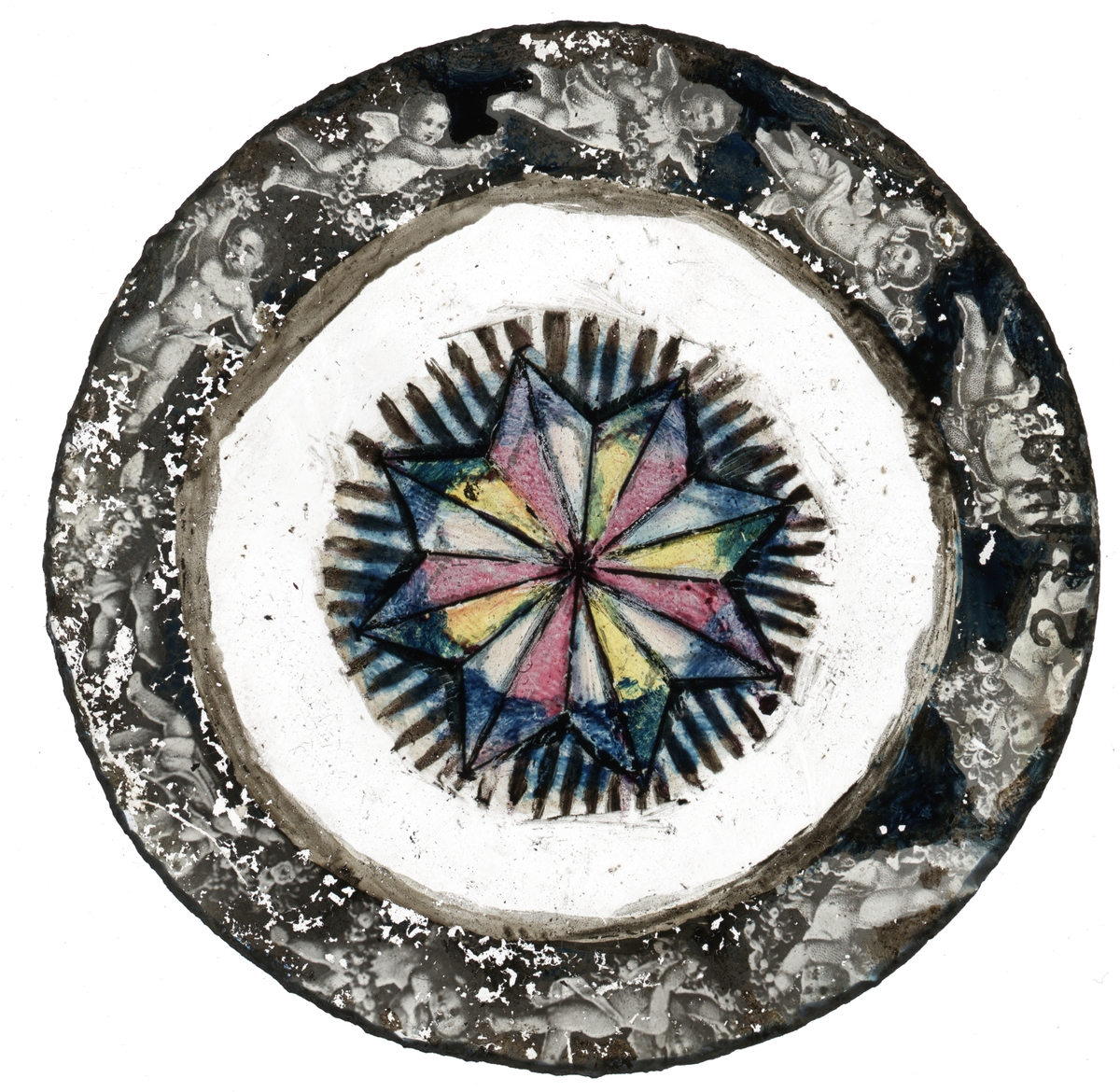 Colorerad bild på glas för Skioptikon/Laterna magica.