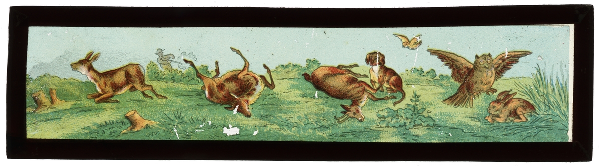 Motiv av jagad och skjuten hjort samt uggla och kanin.