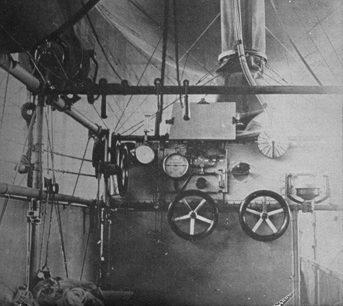 Skioptikonbild med motiv från förarhytten i okänt luftskepp.