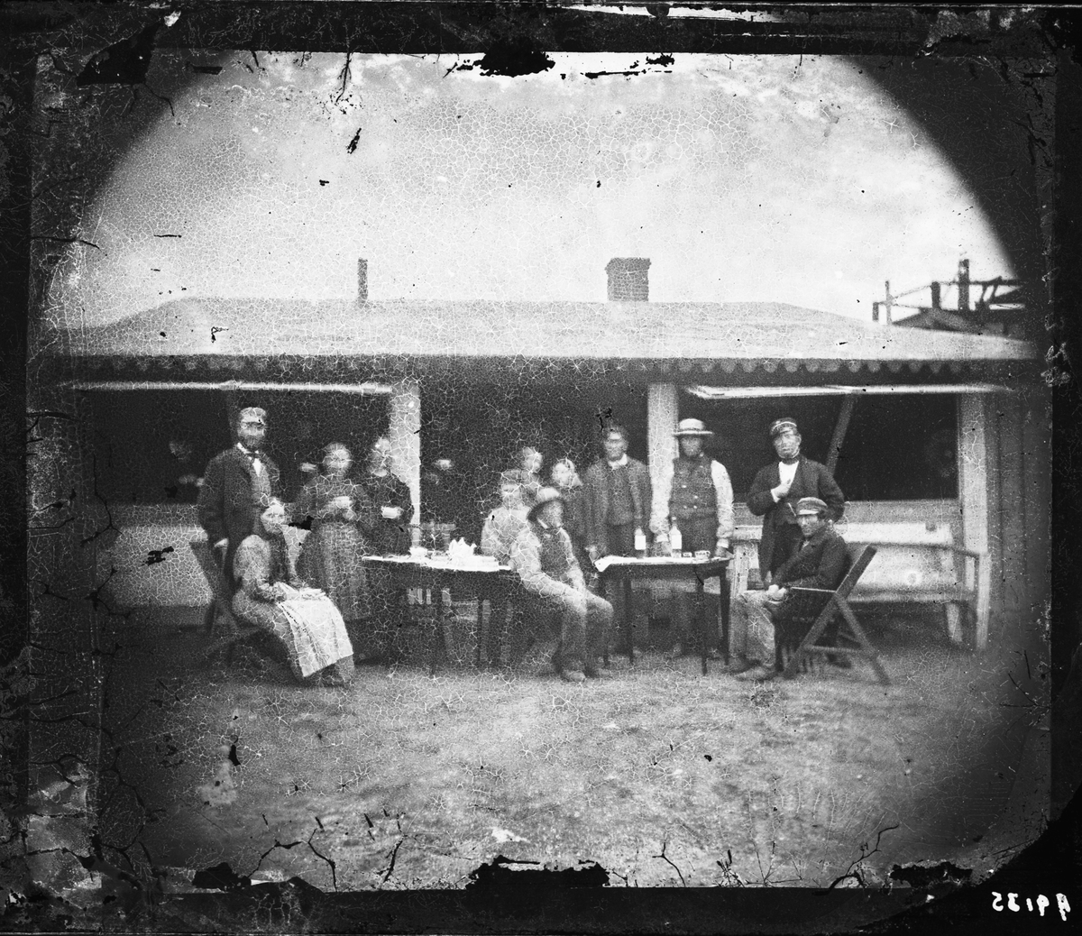 En grupp kaffedrickande människor ute i det fria. I bakgrunden uteplats med tak.