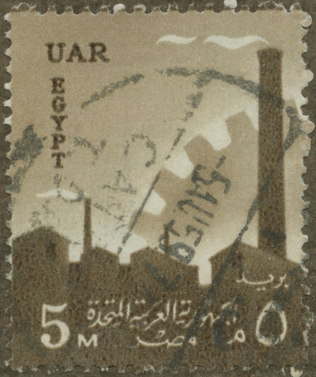 Frimärke ur Gösta Bodmans filatelistiska motivsamling, påbörjad 1950. Frimärke från Förenade Arab Republiker, 1958. Motiv av "Fabriker Kugghjul Symboler för tekniskt arbete"