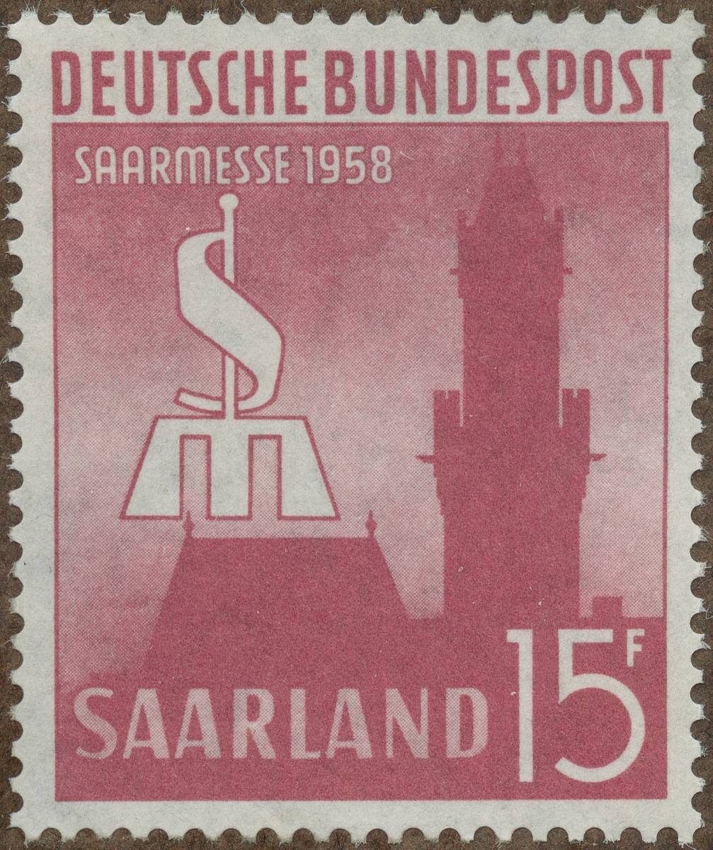 Frimärke från Väst Tyskland, 1958. Motiv av Saar Mässan 1958 Symboler