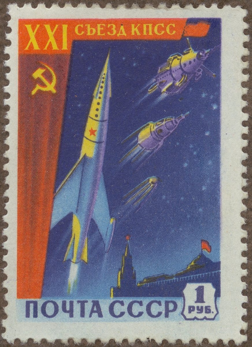 Frimärke från Ryssland, 1958. Motiv av Månraket Tre Sputniker över Kreml. "Minne av Kommunist partiets 21-sta Kongress och "Sovietfolkets erövring av Kosmos":