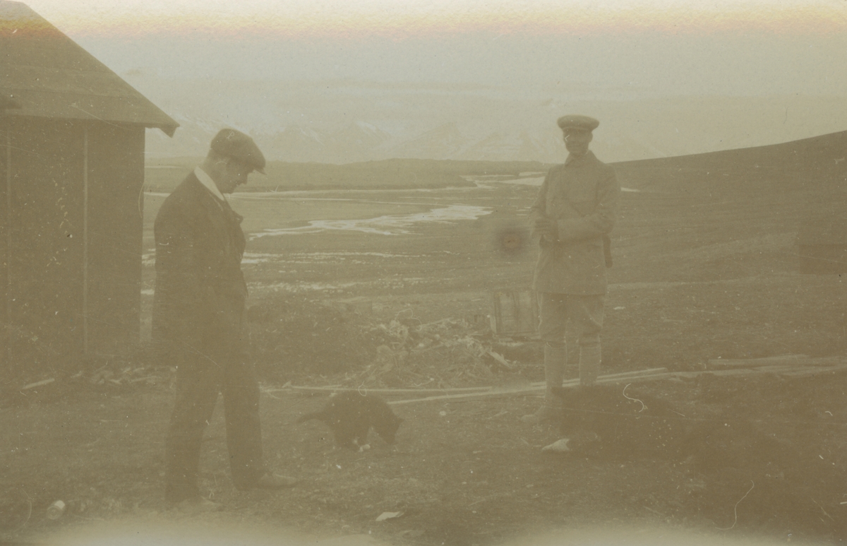 Fotografi från expedition till Spetsbergen. Motiv av två män och en hundvalp vid hus i ett vidsträckt landskap.