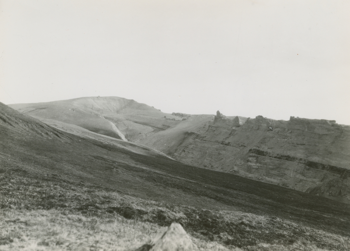 Fotografi från expedition till Östgrönland 1929. Dansk-svensk expedition under ledning av Lauge Koch. Svenska deltagare: Oscar Kulling och Helge Backlund. Vy över bergslandskap.