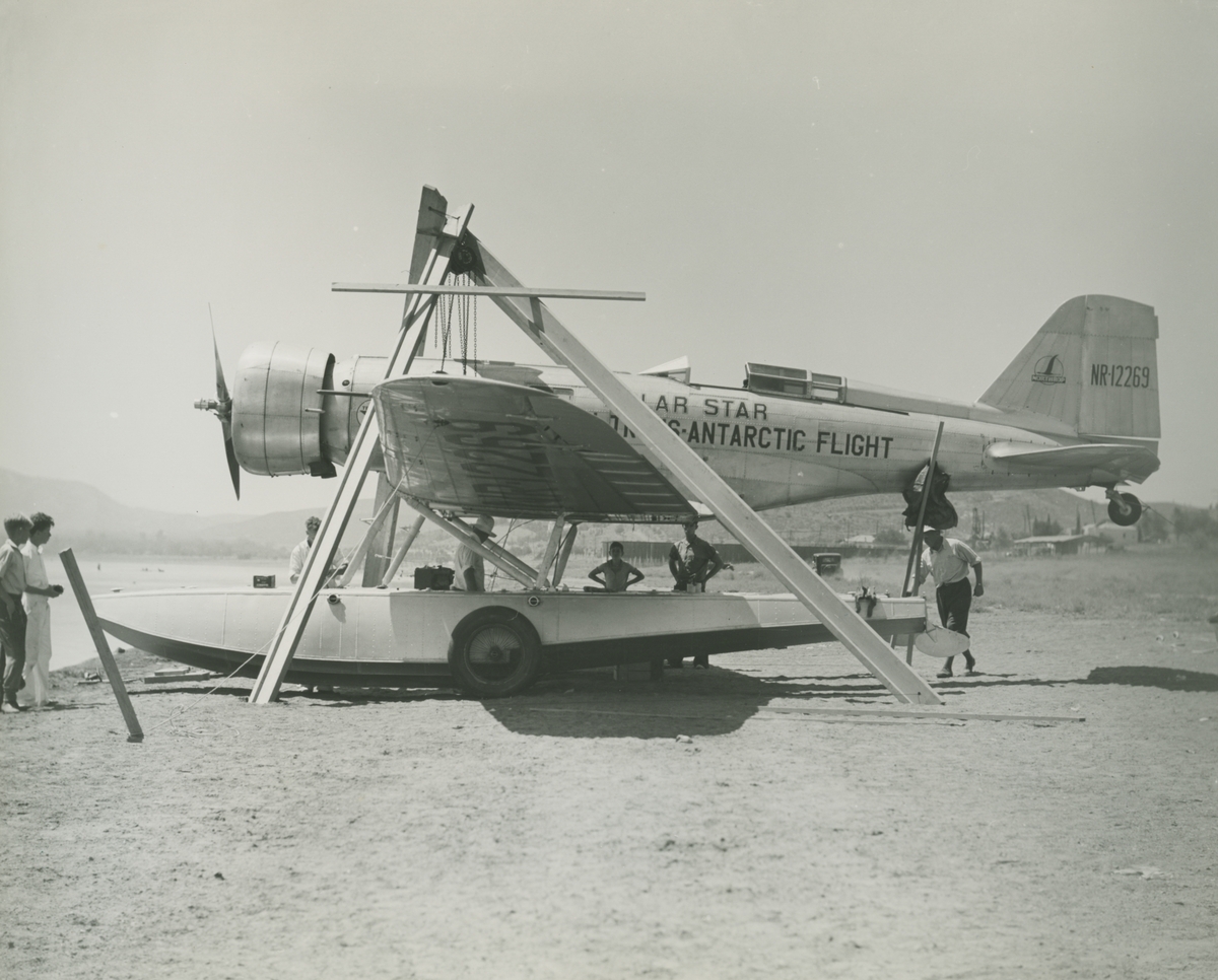 Fotografi från låda märkt Bernt Balchen. Balchen var norsk-amerikansk flygare, polarforskare och militär. Motiv av människor vid flygbåt på strand år 1934.