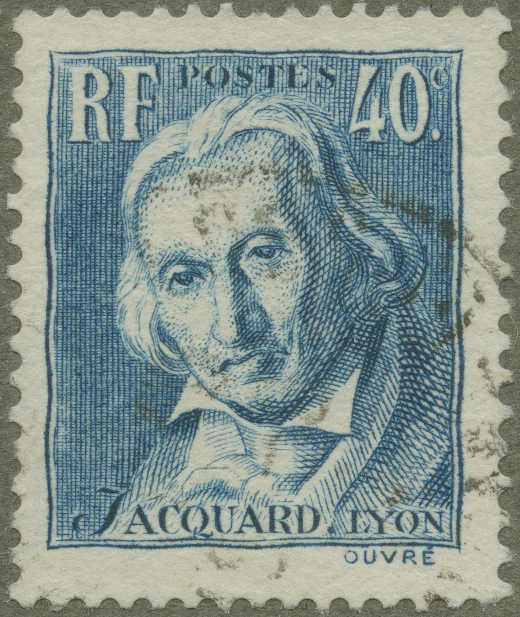 Frimärke från Frankrike, 1934. Motiv av Joseph Marie Jacquard: 1752-1834. Textilman i Frankrike. Konstruerade en mönstervävningsapparat med mönsterkort: "Jacquard-maskinen". -100-årsminnet av hans död: 1834-1934-