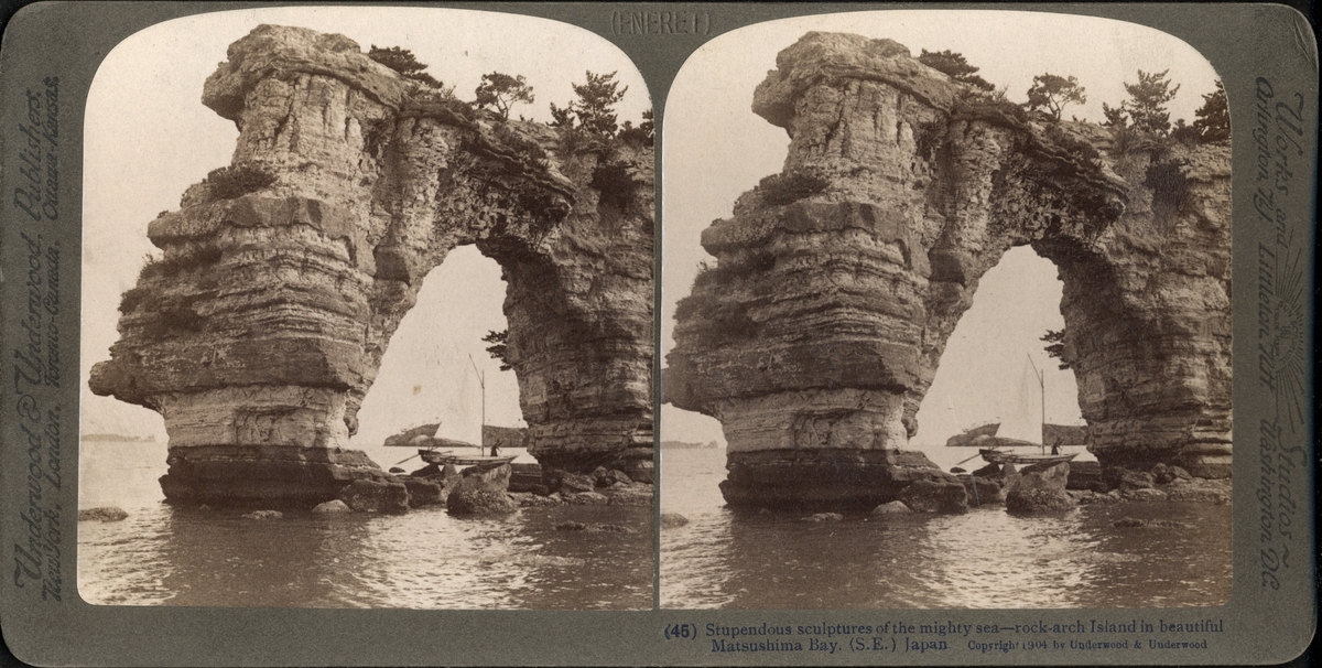 Stereobild av segelbåt vid naturligt skulpterad klippa, Matshusima Bay, Japan.