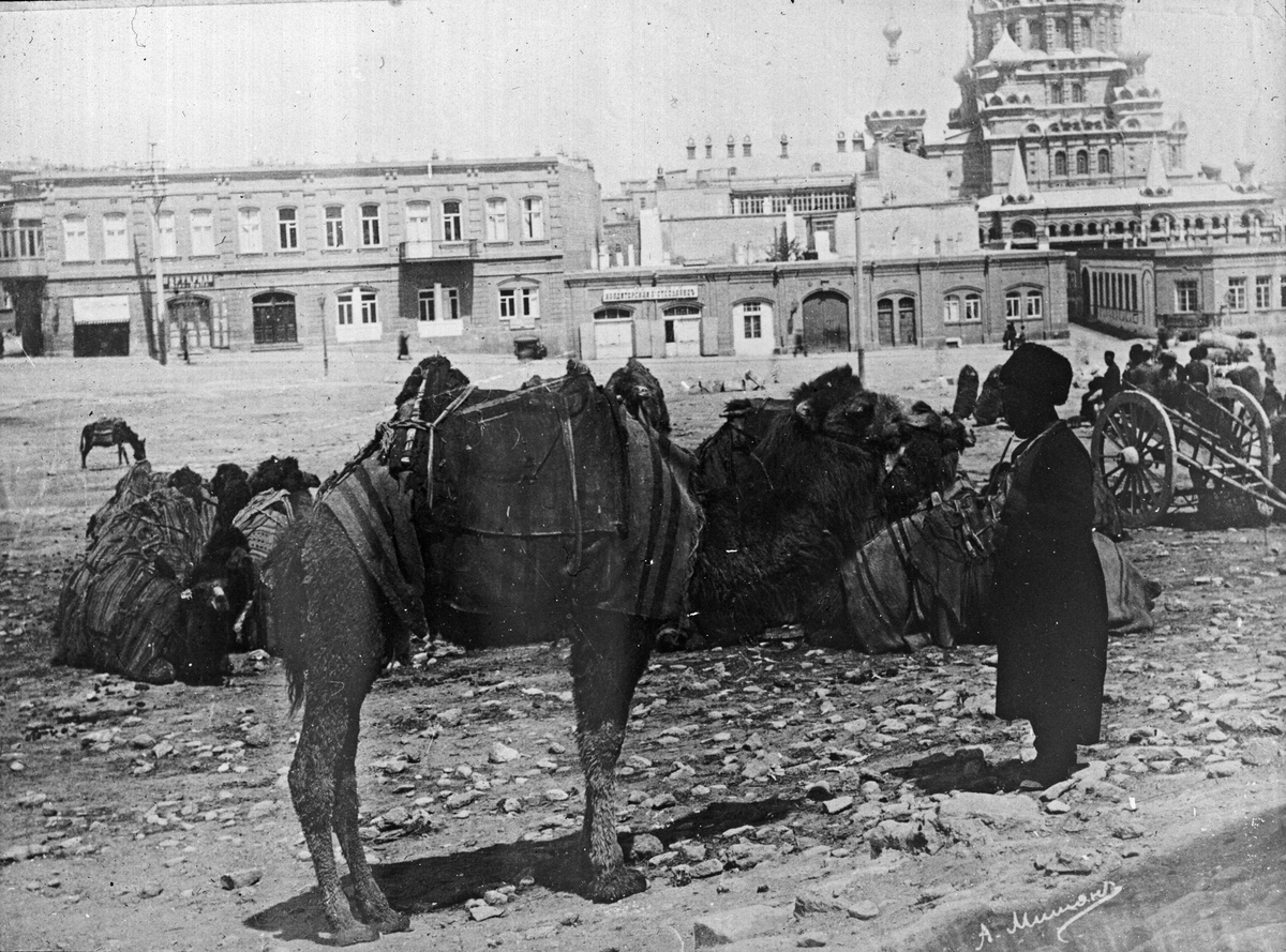 Man med kamel framför tempel i Baku.