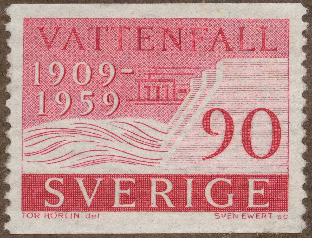 Frimärke ur Gösta Bodmans filatelistiska motivsamling, påbörjad 1950. Frimärke från Sverige, 1959. Motiv av Stiliserad kraftdammsuttag "Vattenfallsstyrelsen 50 årsminne"