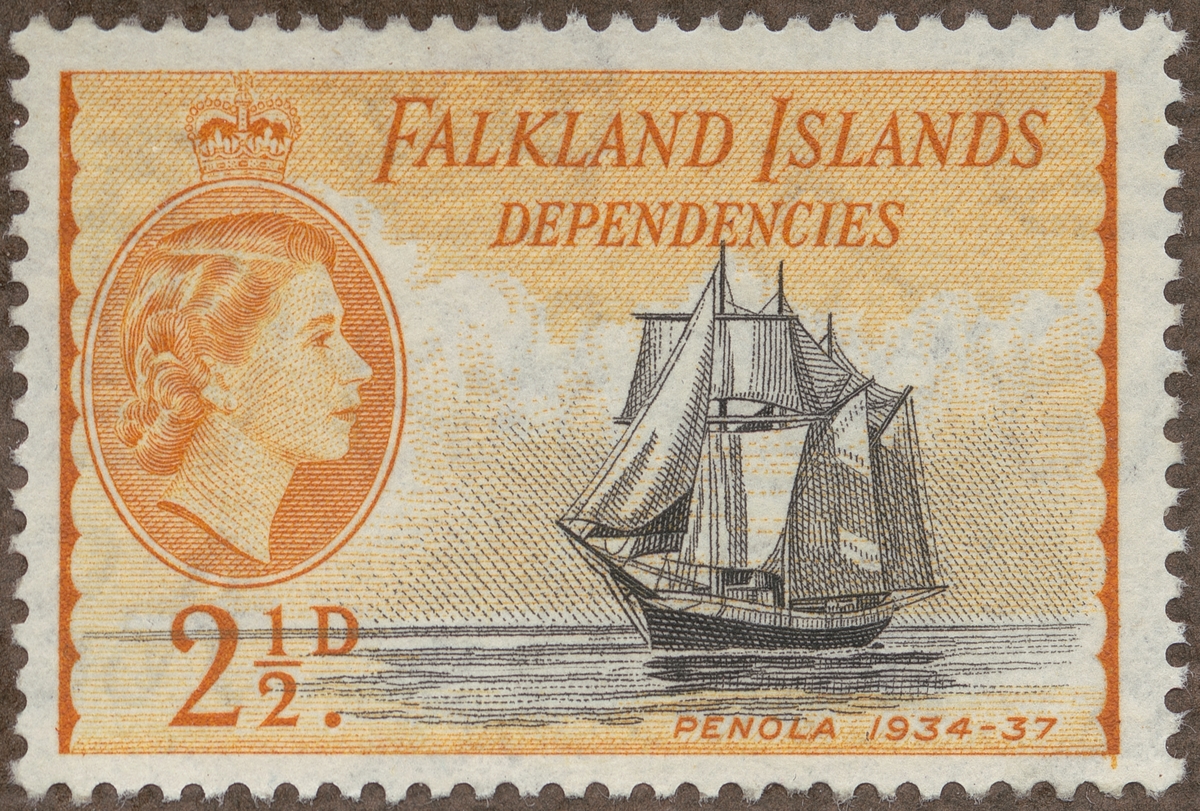 Frimärke från Falklands Öarna, 1954. Motiv av "Penola". Sydpolarfartyg 1934-1937. John R. Rymill (eng) Graham Land, Adelaide-sundet Alexander I-s Ö, Slädtur tvärs över Graham Land på 72 S.
