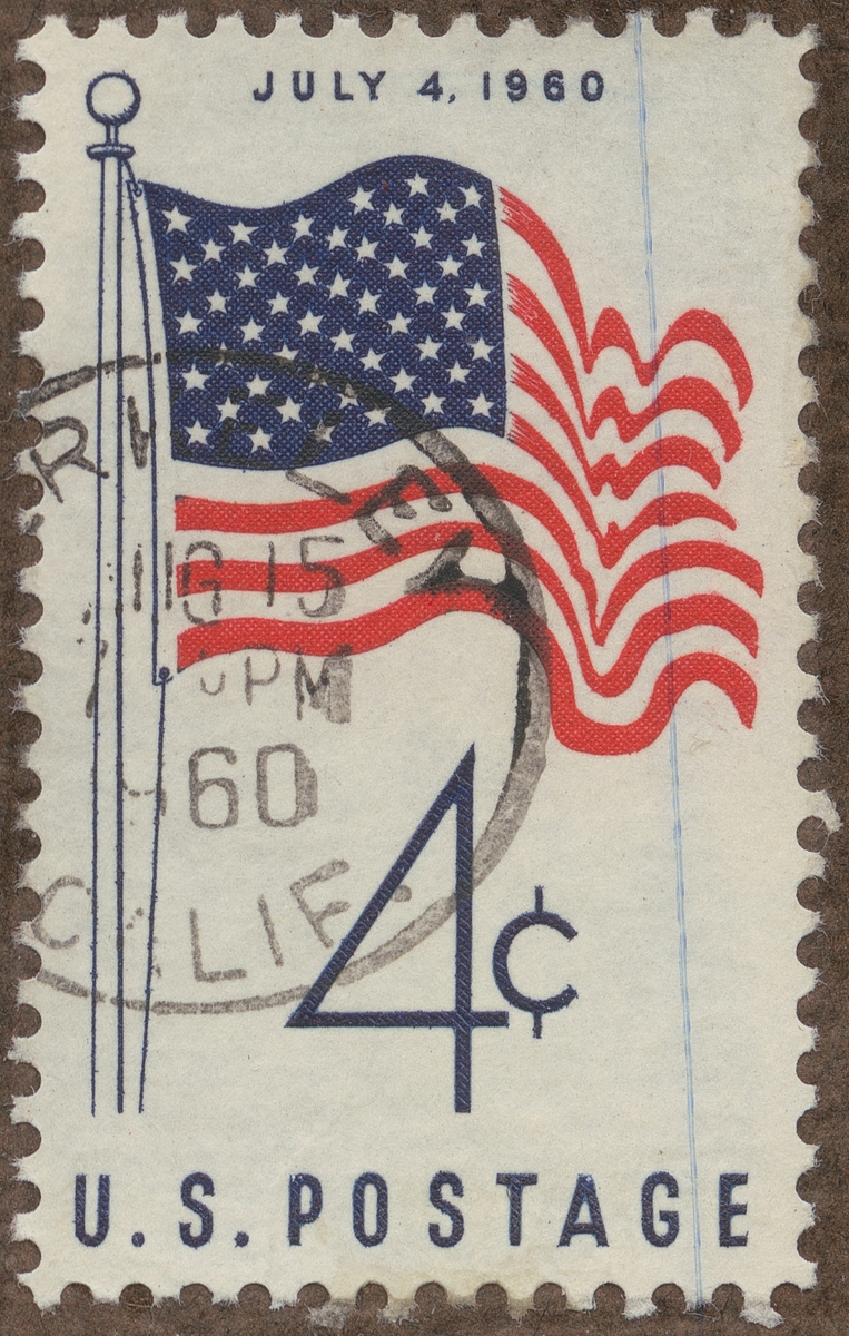 Frimärke från U.S.A., 1960. Motiv av Stjärnbaneret: Amerikanska flaggan: med 50 stjärnor efter territoriet Alaskas vinnande av statsrättighet 1960.