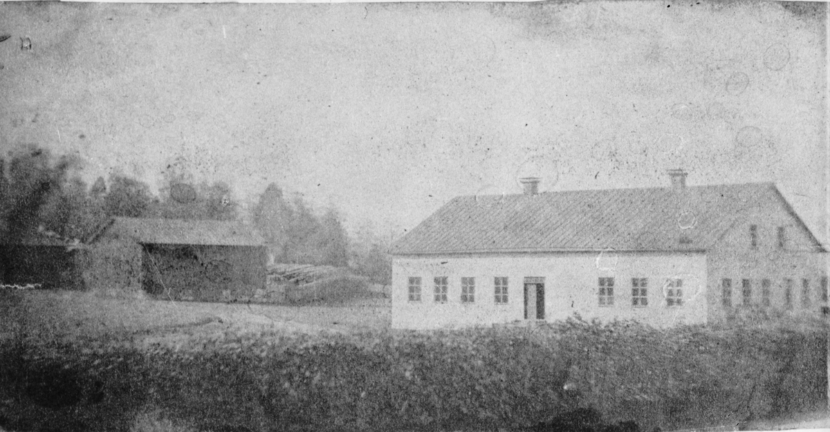 Foto av foto tillhörande Postmästare Helmer Lagergren, Falun (1942). Kontorsbyggnaden vid Klosters Krutbruk 1862.
