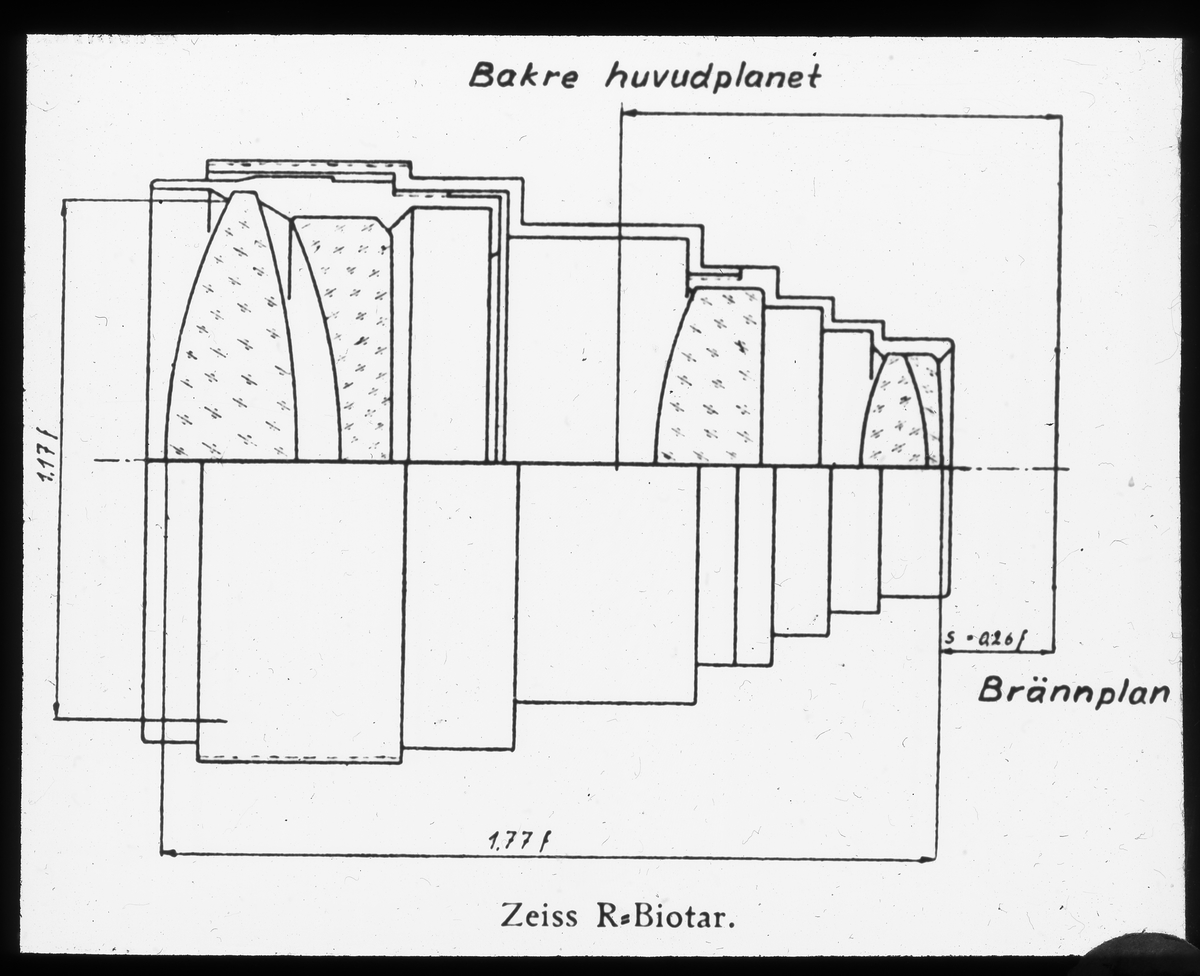 Zeiss R-Biotar med den enorma öppningen F:0,85 (stor bländaröppning). Observera brännplanets läge strax bakom den sista linsen. Objektivet används för röntgenfilmning.