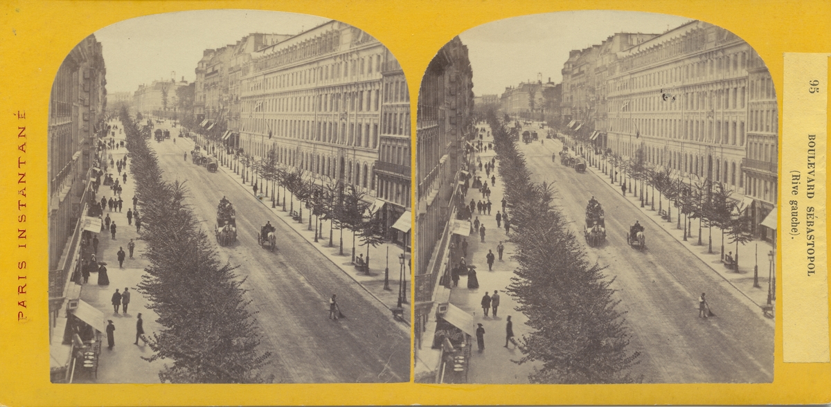 Stereobild med motiv från gatan Boulevard Sébastopol, Paris.