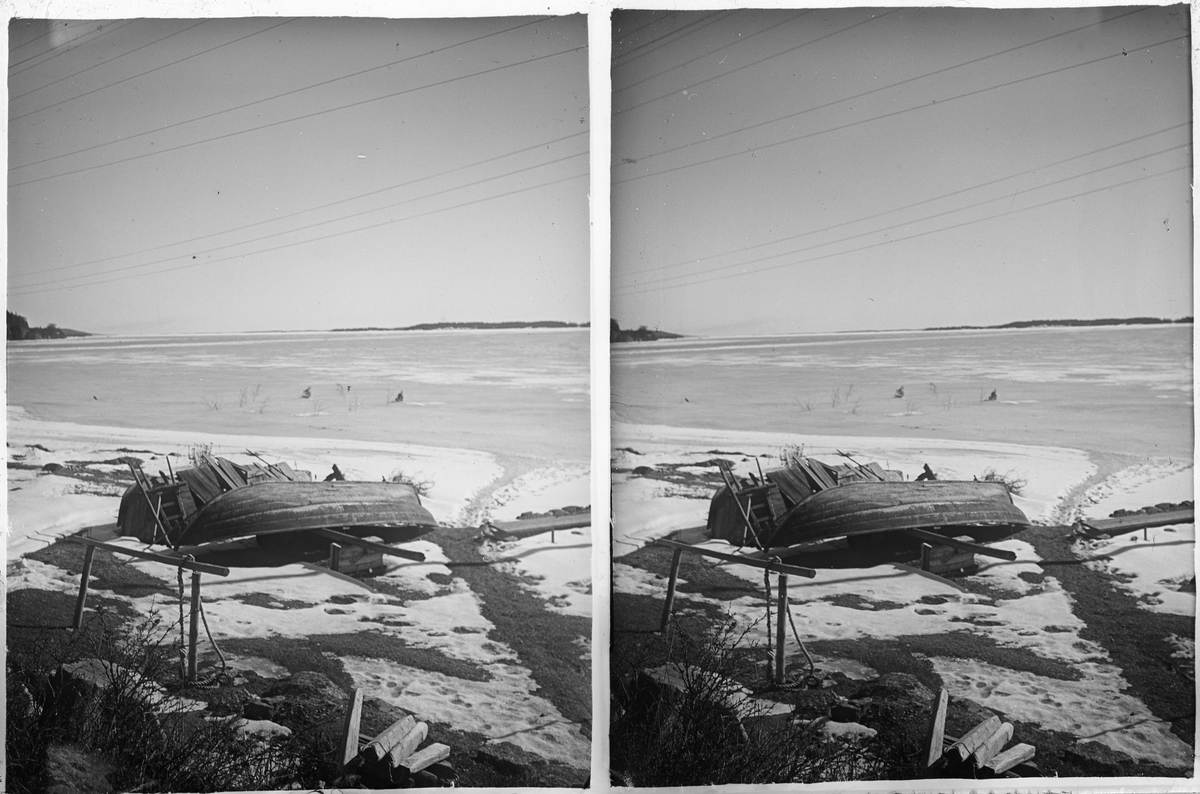 Stereonegativ med motiv av roddbåt på frusen strand. Okänd plats.