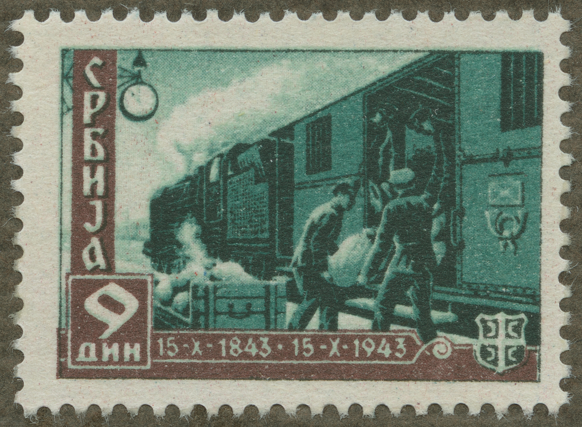 Frimärke från Serbien, 1943. Motiv av Järnvägspostvagn i Serbien Posten 100 år 15.10.1843-15.10.1943