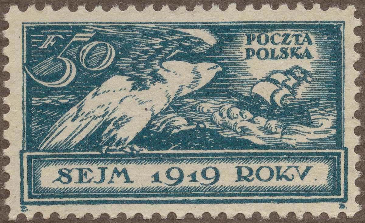 Frimärke från Polen, 1919. Motiv av Mindre segelfartyg i storm. Havsörn. -Minne av första polska riksdagssamling-