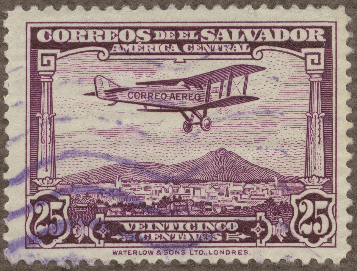 Frimärke från Salvador, 1930. Motiv av Flygplan, tvådäckare över San Salvador